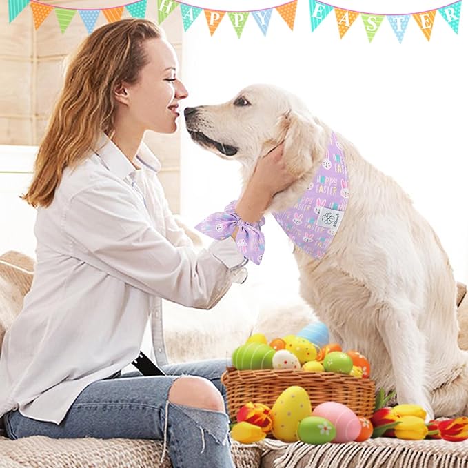 E-Clover Easter Dog Bandana & Matching Scrunchie-Bunny Dog Bandanas Pet Scarf Bib for Medium Large Dogs Girl Boy Owner Gift Purple