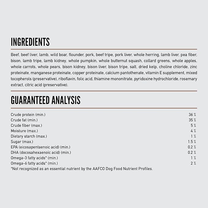 - This freeze-dried dog food is made with 90% raw animal ingredients* including beef, lamb, wild boar, pork and wild-caught fish.