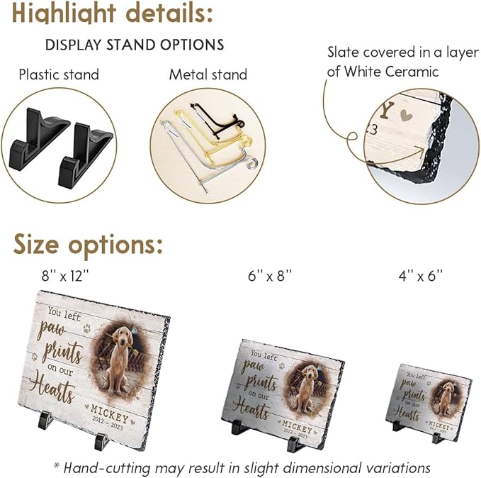 - Size and Stand: Available in three sizes to suit your preference, this stone plaque includes a 2-standing base. Whether you plan to place it inside your dog house outdoors or among your garden decor, it will stand out.