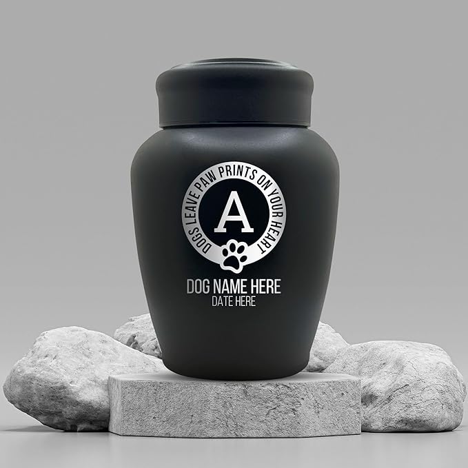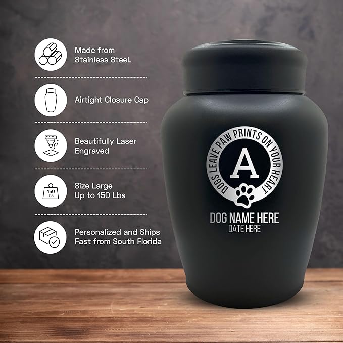 - PERSONALIZATION: This Large Dog Creamation urn is engraved with your dog's name and relevant dates, the urn adds a personalized touch, creating a unique and meaningful tribute to your cherished pet.