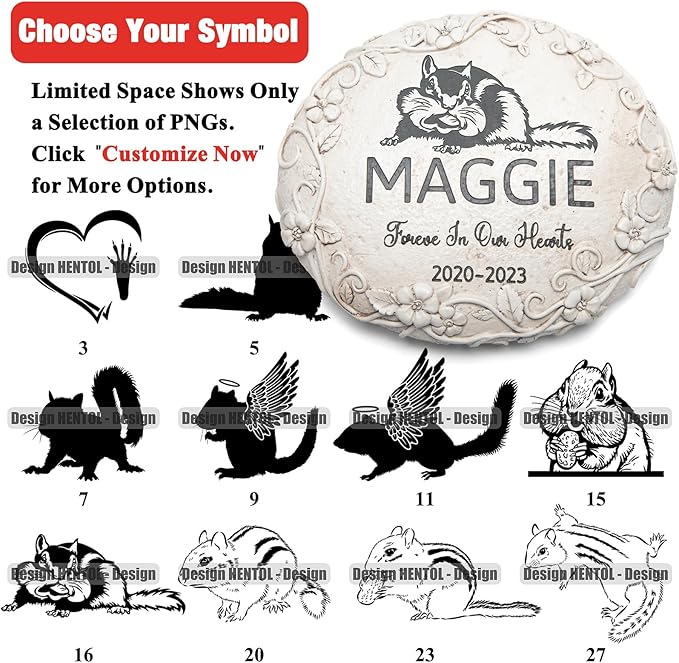 - đăEasy to PersonalizeăGreat product to memorialize your furry loved ones. Click the 'Customize Now' button to upload your pet's name and dates. Leave the typography worries to our skilled designers, who are dedicated to ensuring your chipmunk grave stone showcases the perfect effect.