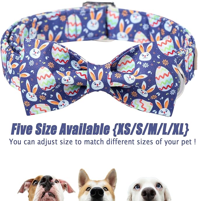 Easter Dog Collar with Bow Tie- Adjustable Easter Bunny Eggs Dog Collar Cute Rabbit Bowtie Metal Buckle Puppy Collars for Small Medium Large Dogs L