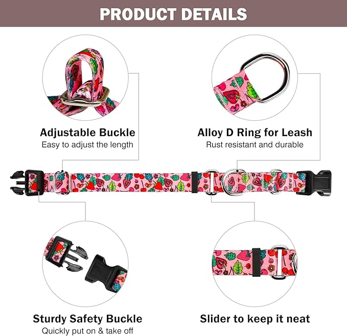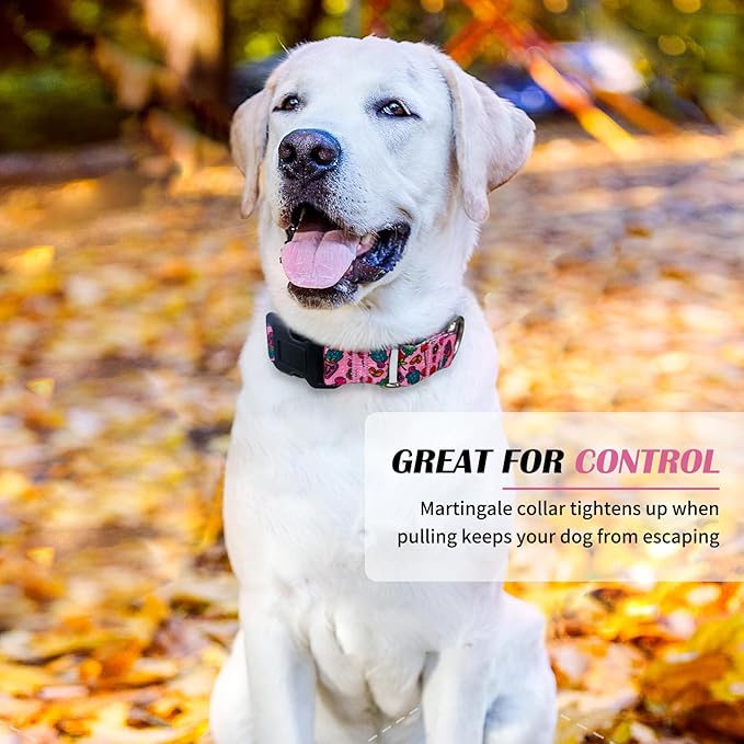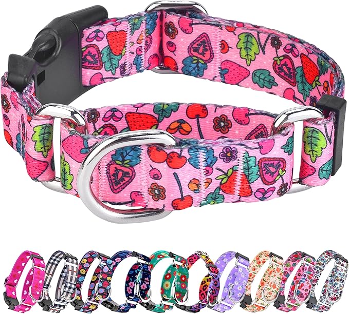 Hikiko Summer Dog Collar for Small Medium Large Dogs, Adjustable Nylon Fruit Pattern Martingale Collars with Quick Release Buckle (Pink Strawberry,S)