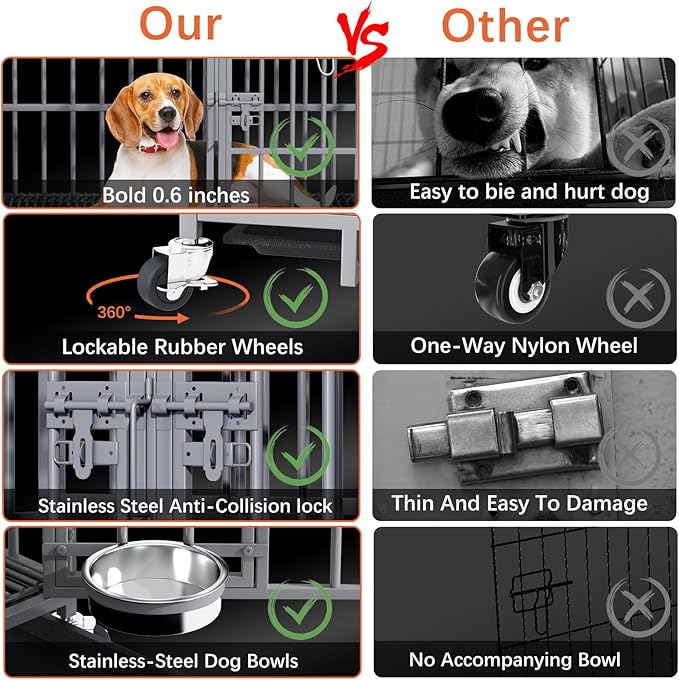 - ăPractical & Easy to Move and CleanăThe dog crate comes with four smooth rolling locking wheels for easy movement and fixation, you can easily move the crate to different positions as needed. The dog crate comes with a pull-out tray for easy removal and cleaning. It also comes with a safety latch to avoid your smart dog from opening the iron door, effectively protect your pet.