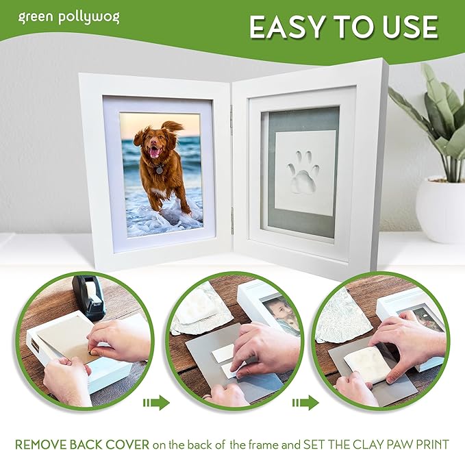 - HAND-FINISHED PINEWOOD FRAME – Green Pollywog’s Clay Paw Imprint Pet Keepsake Hinged Photo Frame boasts a clean and modern finish that complements a variety of interior décor styles. Crafted from hand-finished white pinewood, the frames exhibit an artisan's touch, paying homage to your pet in a way they truly deserve. These high-quality frames are constructed with museum-grade glass, providing UV protection to ensure photos remain vibrant and fade-resistant.