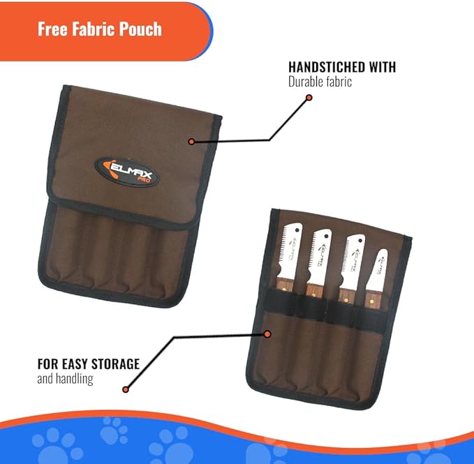 - Usage of stripping knife set: Dog grooming stripping knife are ideal for carding, stripping, plucking and removing excess undercoat. These stripping knives quickly strip hairs from wire coats with 4 different types of stripping comb for dogs which covers almost all area of the coat.