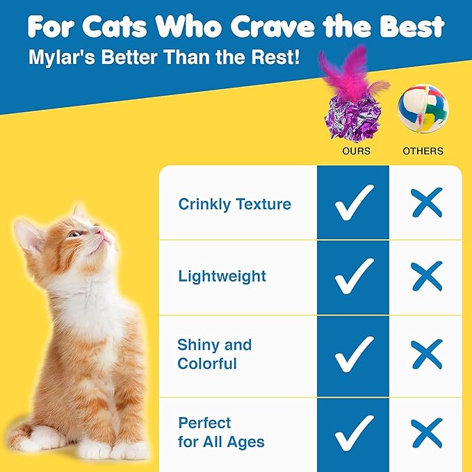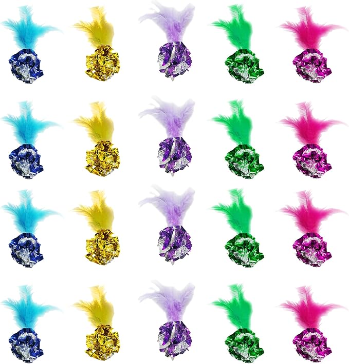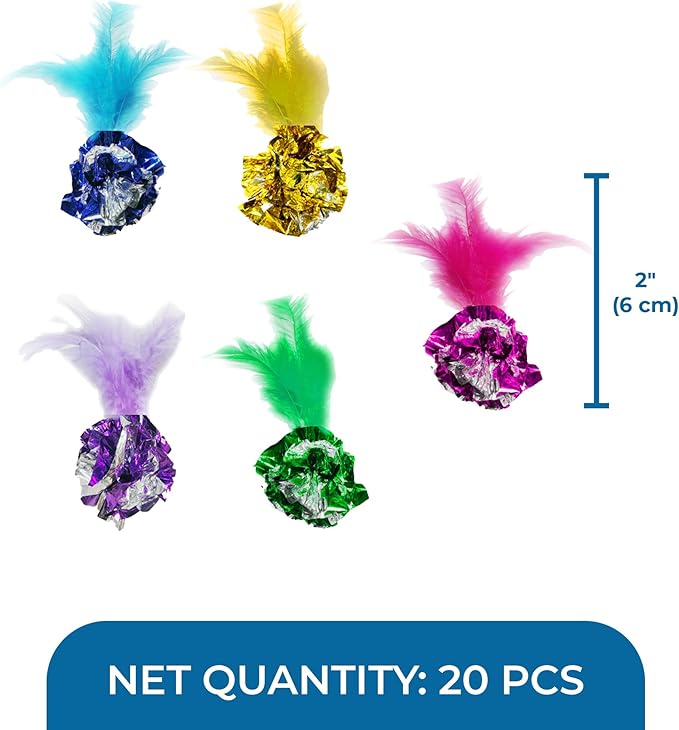 SunGrow Mylar Crinkle Balls with Feathers, 2.5-Inches, Shiny Stress Buster Crinkler, Suitable for Multiple Cats' Engagement, Ideal for Kittens and Grown-ups, 20-Pcs