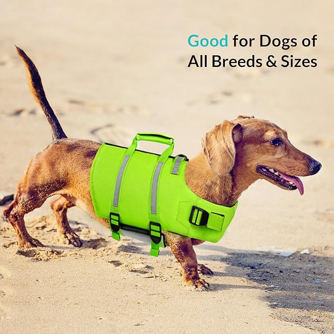 Queenmore Dog Swim Vest - Lightweight Adjustable Reflective Puppy Pet Float Life Preserver with Back Zip, Rescue Handle, Metal Hook (Green XXL)
