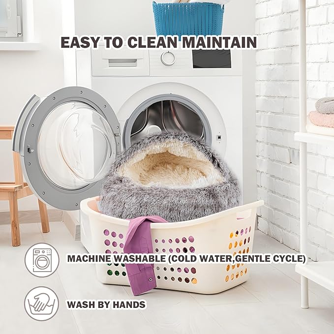 Cat Bed for Indoor Cats, Calming Cozy Cave with Self-Warming Plush, Entire Bed Machine Washable & Anti-Slip Base, Breathable Pet Bed for Small Cats&Dogs All Seasons (Khaki, 24 * 24inch)