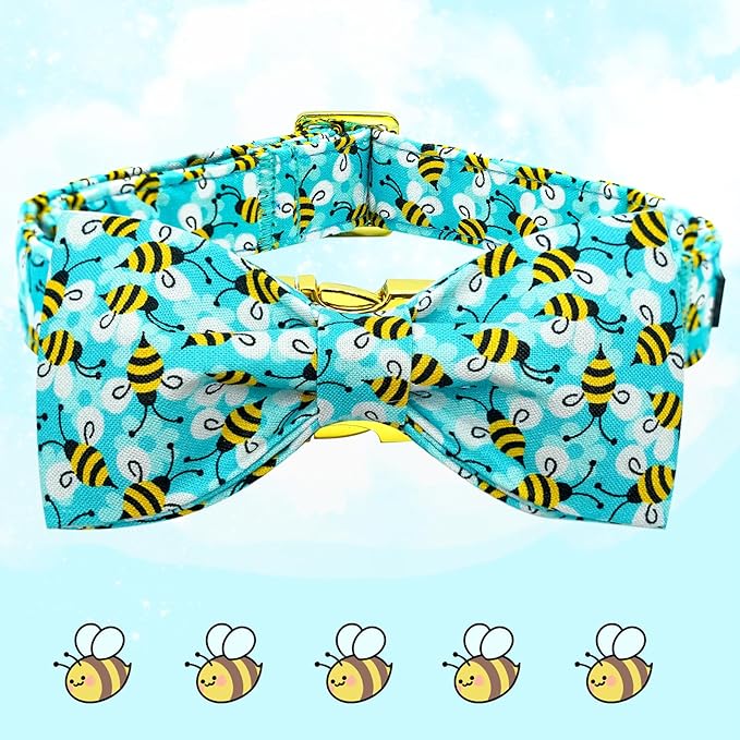 Elegant Little Tail Blue Bees Print Dog Collar with Bow Tie for Small to Large Dogs