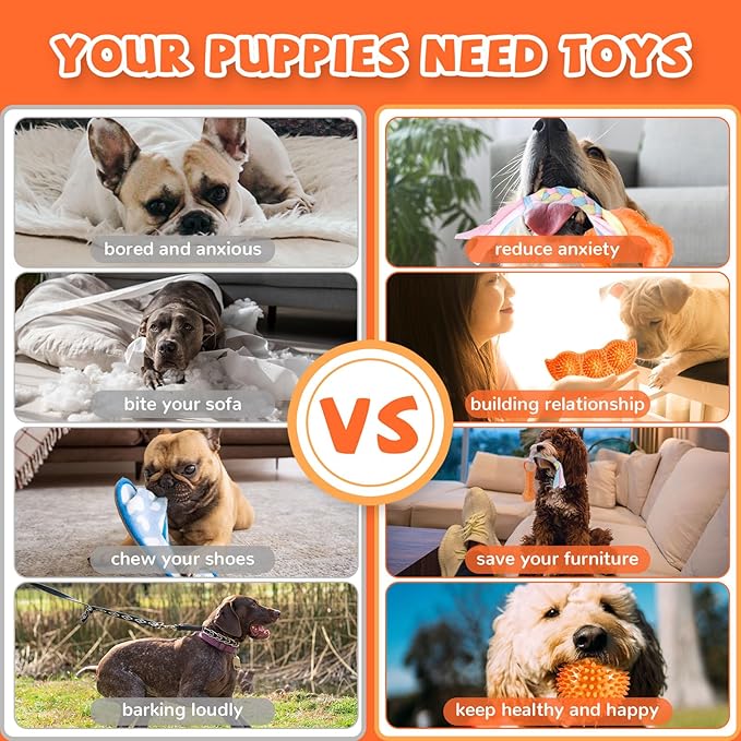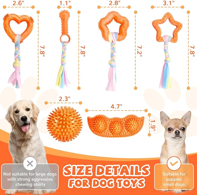 About This 6 PCS ORANGE PUPPY TOYS SET:The small dog chew toys bundle includes a variety of shapes,from squeaky chewing... Read more