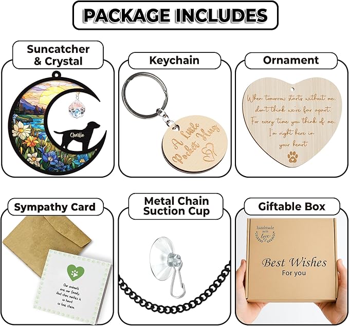 - Thoughtful Sympathy Gift Set for Dog Lovers: Includes a personalized dog memorial suncatcher, engraved pet memorial keychain, dog remembrance ornament, and loss of dog sympathy card. A complete and meaningful gift set to support anyone grieving the loss of a beloved dog.