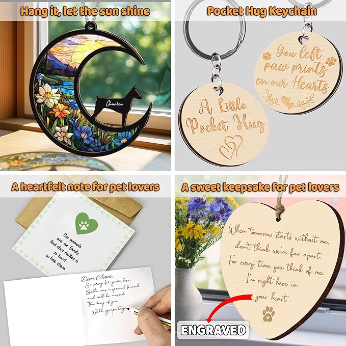 - Package Includes: 1 Memorial Suncatcher Dog comes with a long iron chain, 1 Pen, 1 Gift Box. Choose from 80 dog breed templates - if your pet's breed isn't listed, we offer customized designs.