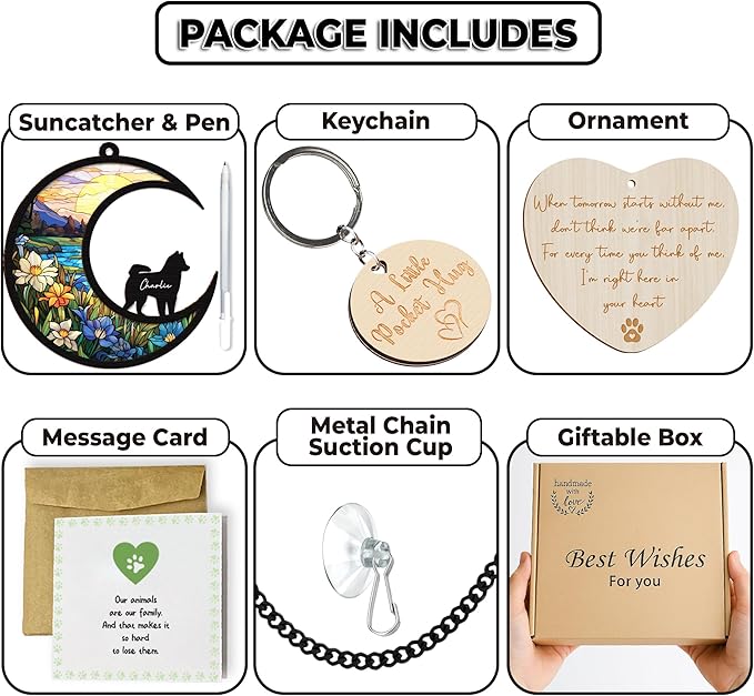 - Package Includes: 1 Memorial Suncatcher Dog comes with a long iron chain, 1 Pen, 1 Gift Box. Choose from 80 dog breed templates - if your pet's breed isn't listed, we offer customized designs.