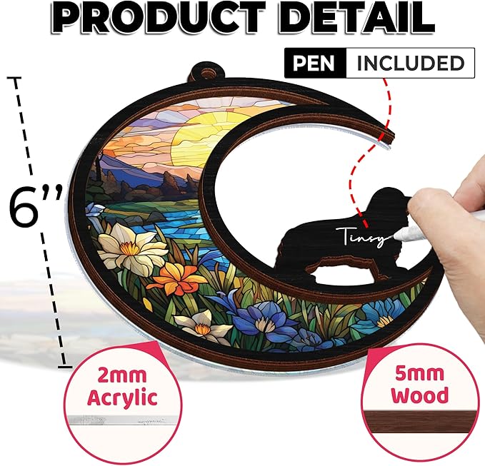 - Package Includes: 1 Memorial Suncatcher Dog comes with a long iron chain, 1 Pen, 1 Gift Box. Choose from 80 dog breed templates - if your pet's breed isn't listed, we offer customized designs.