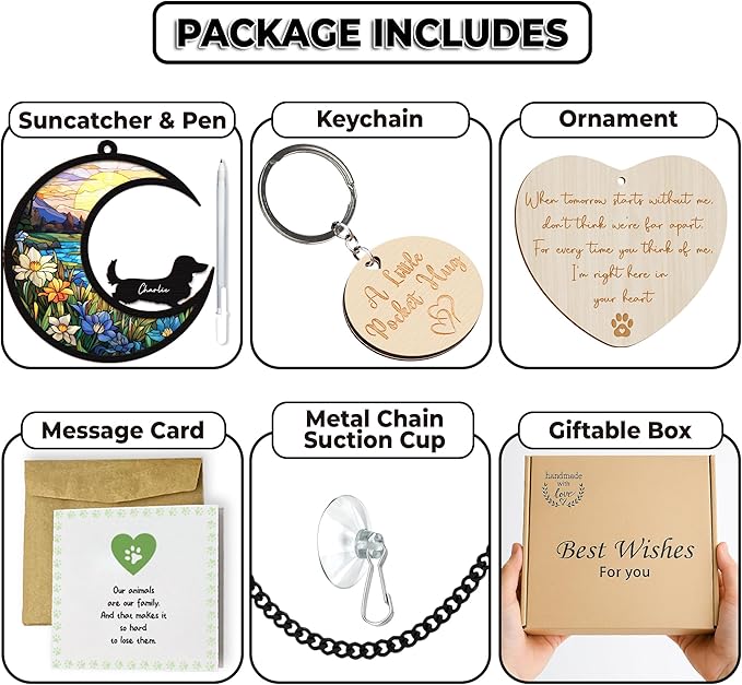 - Package Includes: 1 Memorial Suncatcher Dog comes with a long iron chain, 1 Pen, 1 Gift Box. Choose from 80 dog breed templates - if your pet's breed isn't listed, we offer customized designs.