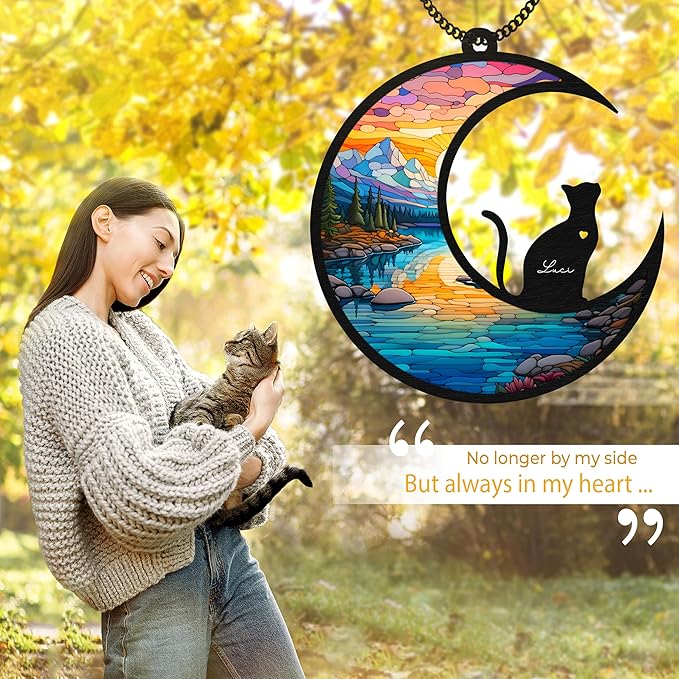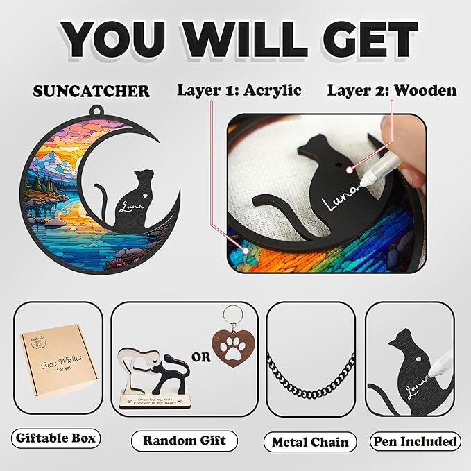 - Package Includes: 1 Memorial Suncatcher Cat comes with a long iron chain, 1 Pen, 1 Pet Lover Gift, 1 Gift Box. Painstakingly designed with profound care and meticulous attention to detail, this personalized cat memorial ornament holds profound meaning as a treasured keepsake for those who hold their beloved pets close to their hearts.