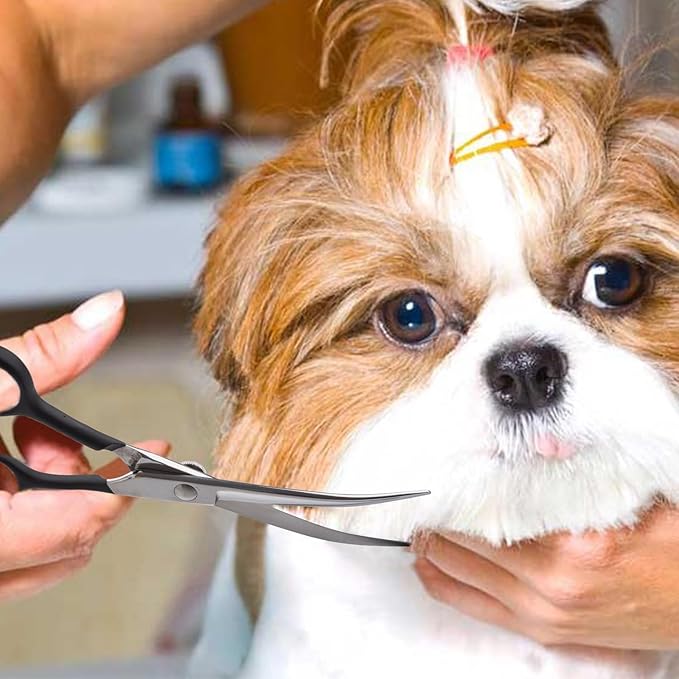 - MULTIFUNCTIONAL - 6 inches curved dog scissors with 2.5 inches blades, the professional curved shears dog grooming are ideal for pet hospital, pet salon, and family to use on dogs, cats and the like. The curved dog scissors blades are especially suitable for grooming the dog eyes, face, ears, paws, head and other sensitive areas.