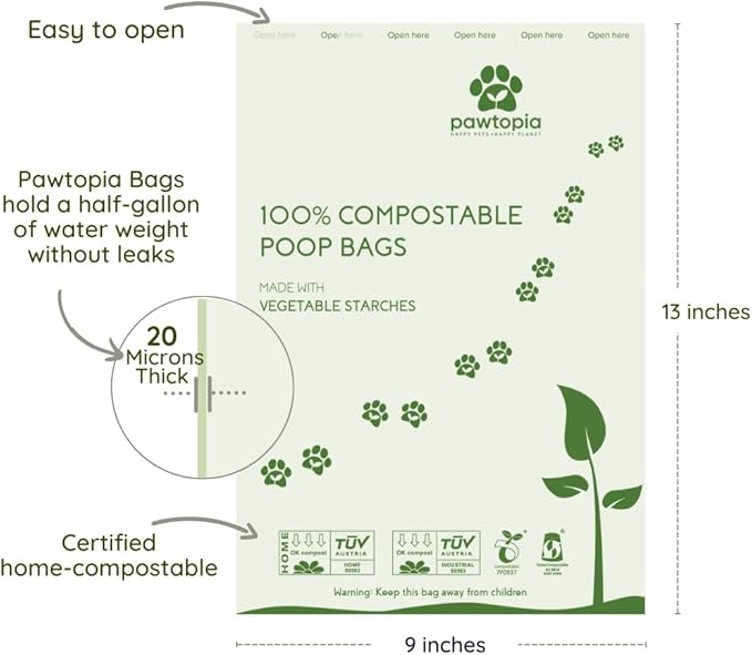 - Certified Home Compostable Bags (dog poop bags/ Cat Litter Bags/ Food Compost): Pawtopia supports sustainable living and does not harm the environment (unlike plastic bags). Our biodegradable dog poop bags, made with vegetable starches (corn starch), are 100% home compostable and break down into natural substances such as water, Co2, and biomass. Our biodegradable poop bags are certified with OK Compost Industrial under EN 13432 (equivalent to ASTM6400), and OK Compost Home by Tüv Austria under AS5810/ NF T51800.