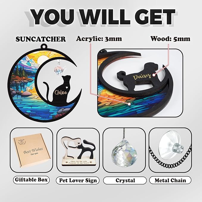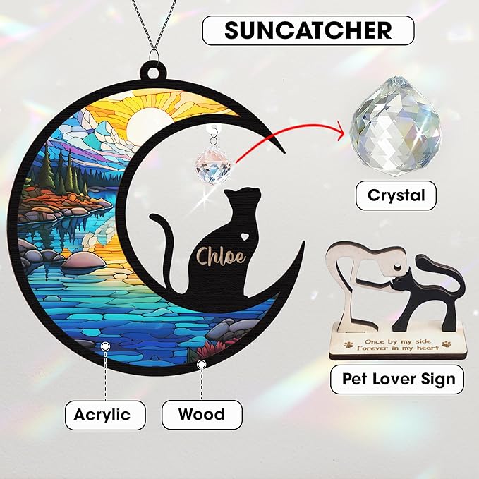 - Package Includes: 1 Memorial Suncatcher Cat comes with a long iron chain, 1 Pet Lover Sign Gift, 1 Gift Box. Painstakingly designed with profound care and meticulous attention to detail, this personalized cat memorial gift holds profound meaning as a treasured keepsake for those who hold their beloved pets close to their hearts.