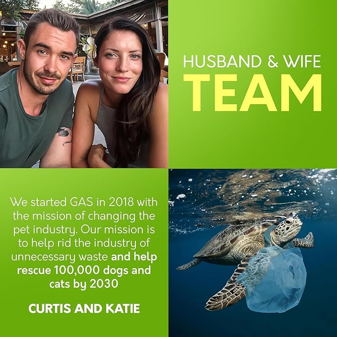 - SMALL BUSINESS WITH A BIG HEART - Founded in 2018 by Curtis and Katie, a dynamic husband and wife duo, G.A.S is not just our business - it's our passion. Dedicated to revolutionizing the pet industry, our small team is big on making a positive impact on the planet and helping animals in need. It's our mission to rescue 100,000 animals before the end of 2030.