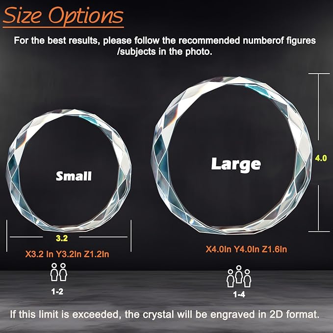 - Customize Process: Click the “Customize” button to upload your 2D high-resolution photo and your message, our experienced art designer will professionally convert your 2D photo into a 3D format. We will make necessary adjustments, such as background removal. Larger crystal contains more dots which delivers more details of the photo.