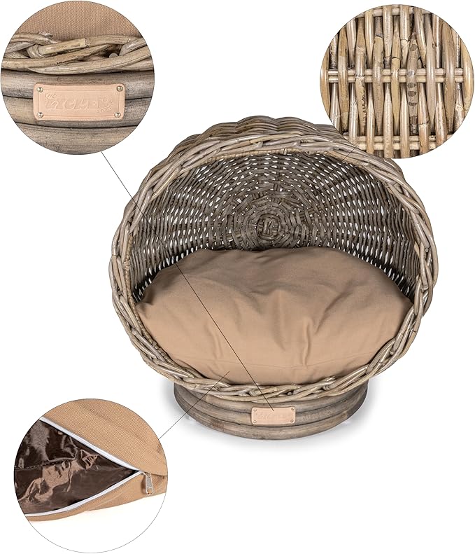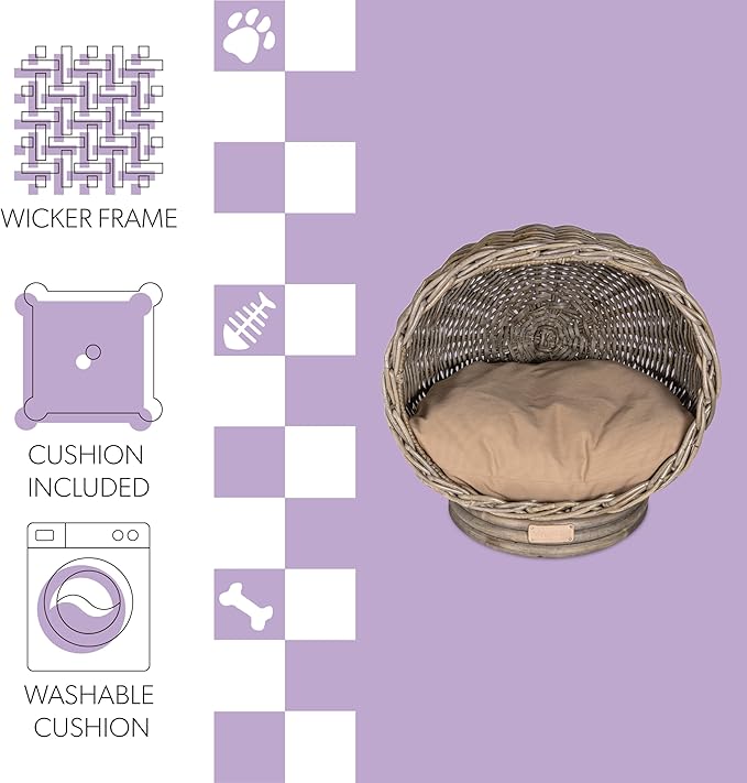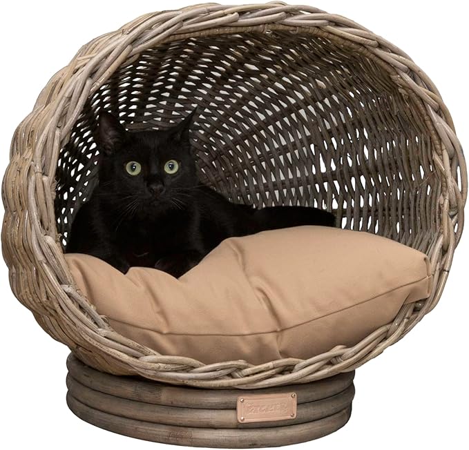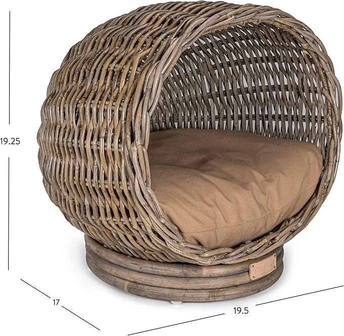 CBD1001A Socket Dome 19.5" x 17" Bohemian Handwoven Rattan Cat Bed with Machine-Washable Cushion, Kubu Gray