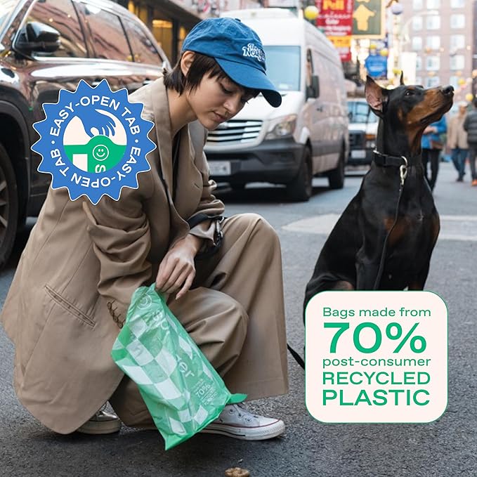 - 70% POST-CONSUMER RECYCLED PLASTIC: These durable and reliable dog waste bags help reduce environmental impact. Feel good about using bags that divert plastic from landfills.