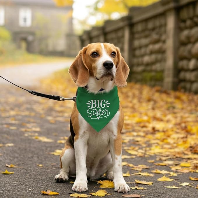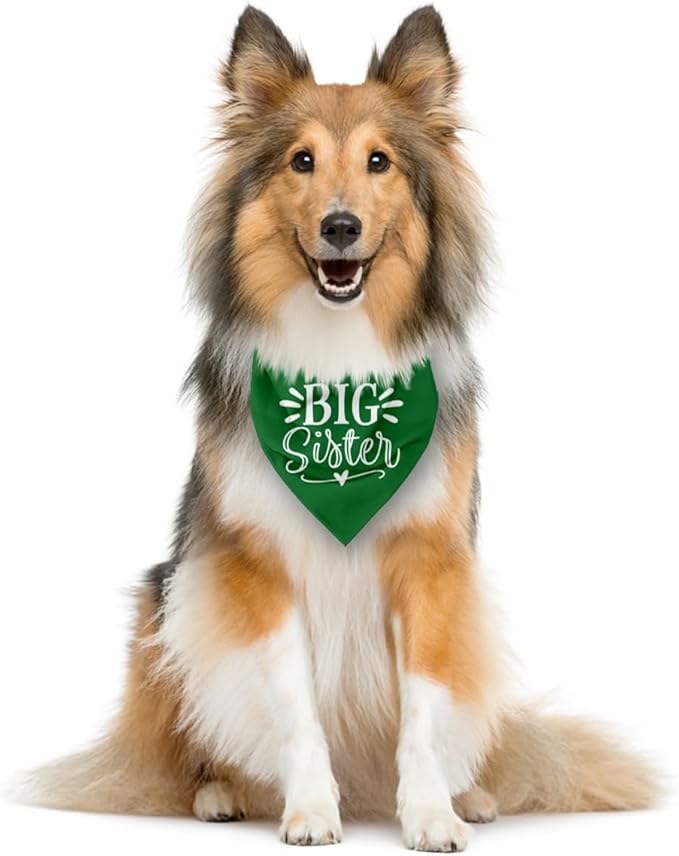 Big Sister Dog Bandana, Green, Triangle, 25 x 17 Inches, Flannel, Comfortable, Water Resistant, Geometric Pattern, Baby Shower, Unisex, Medium Dog Size, V-Neck, Machine Washable