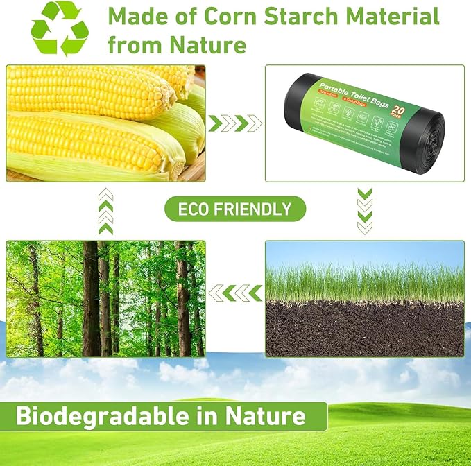 - 【Sturdy & Durable】Our disposable toilet replacement bags are made from plant-based materials, break down quickly and easily. designed to break down naturally in just 45-180 days when buried in soil. load-bearing about 11-15LB, super tough, durable, opaque, leak-proof to prevent unpleasant messes, keep everything clean.