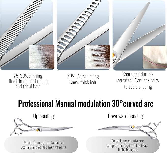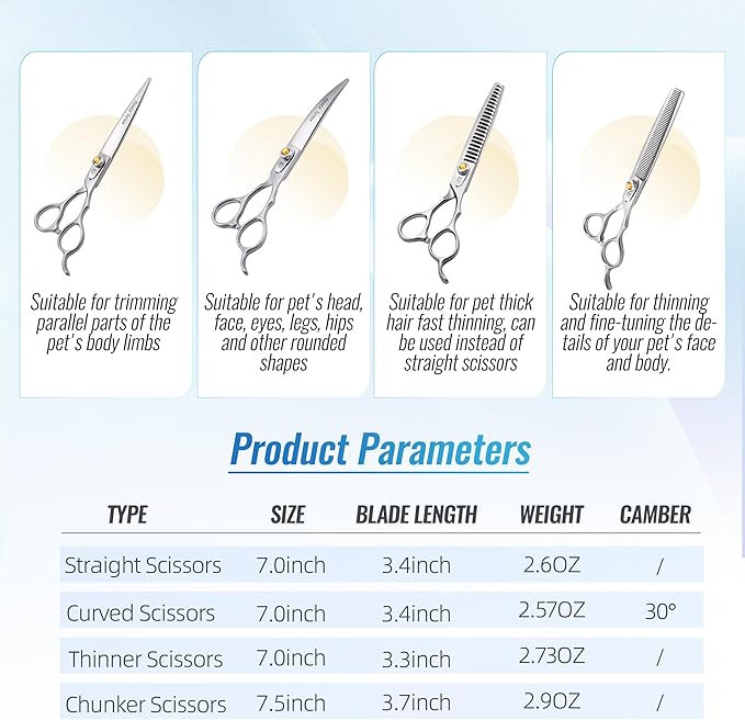 - Features: These pet scissors set with ergonomic handles that fit most people. Fine polished brushed surface with delicate metal texture. Precise adjustable screws effectively prevent the screws from loosening due to prolonged use.