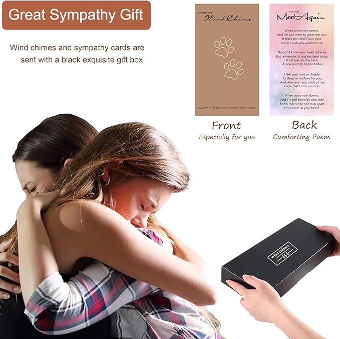 - 【Dog Memorial Gifts】Pet sympathy wind chimes are securely packaged in elegant black gift box. Each dog remembrance gift is wrapped and protected with thick packing paper. In addition to the pet loss sympathy wind chimes, there is also a beautiful and heart-warming poem card. This heartfelt gift serves as a meaningful expression of sympathy and condolences for the loss of dog. Our furry baby is never forgotten.