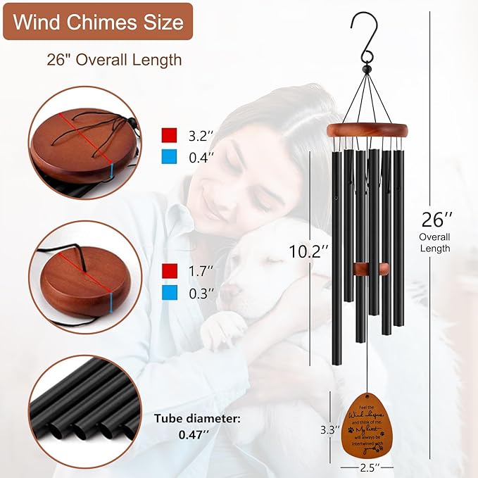- 【26 Inch Sympathy Wind Chimes】Hang the wind chimes for outside in a tree, patio or memorial garden as unique outdoor decor. Overall hanging height from hook top to pendant bottom is 26", 6 aluminum tubes ranging in size from 7.1" to 10.2". It is perfectly medium-sized, not too small like 19"or too large as 38".