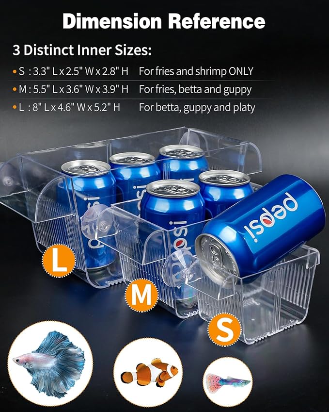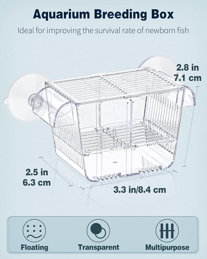 About This Small Fish Breeding Box: 3.3" L x 2.5" W x 2.8" H. The aquarium fish breeding box protects... Read more