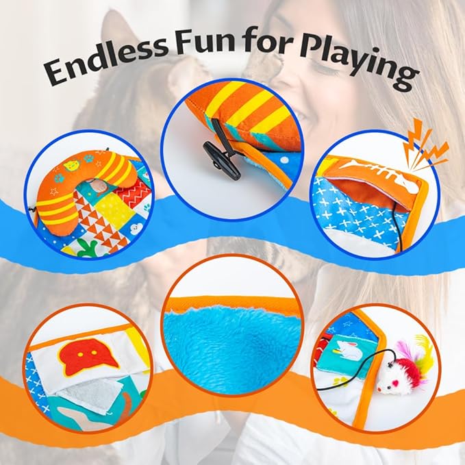 - 【Kittens will be obsessed】Our cat activity mat is specially designed to satisfy cats' preferences. Cat pillows, catnip, crinkle pockets, strings and small toys will make cats completely fascinated. These little cuties will entertain themselves and no longer step on your keyboard, grab your sofa, and hit you in the middle of the night.
