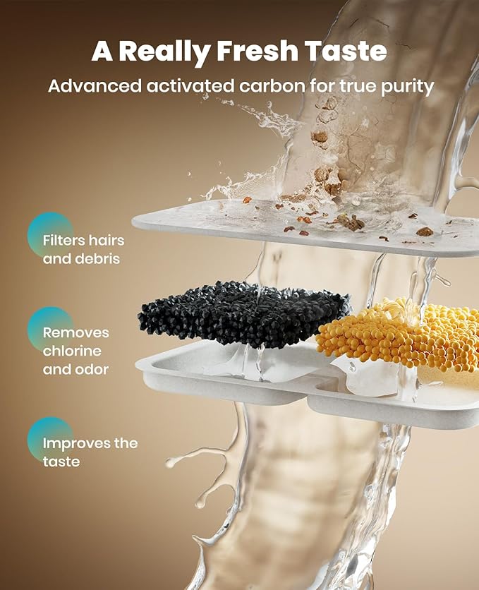- [Premium 304 Stainless Steel & 4-Stage Filtration]: Healthier & Durable! Give your pets the cleanest, safest water with our rust-resistant 304 stainless steel dog water fountain. Upgraded 4 filter layers effectively capture impurities like fur, odors, etc. Unlike plastic fountains, our dishwasher-safe, easy-to-clean design ensures fresh water daily—protecting your pet’s kidneys and overall health.