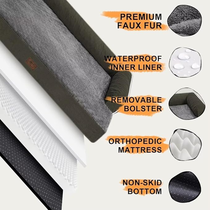 Large Dog Bed Orthopedic Washable - Beds Bolster Pet - XL Large Big Dogs - Memory Foam - Couch Sofa Bed- Waterproof with Removable Cover - Dark Green Dog Bed