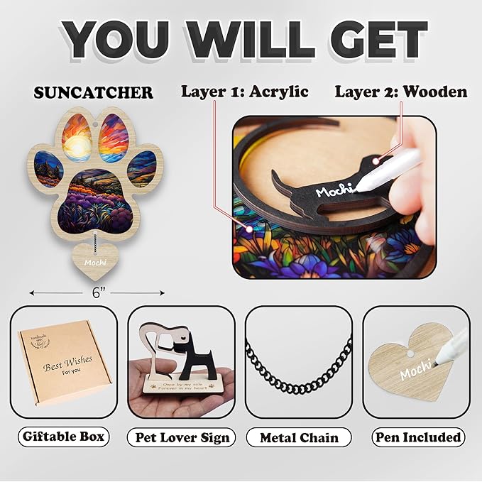 • Package Includes: 1 Pet Paw Suncatcher Memorial with a long iron chain, 1 Pet Lover Sign, 1 Pen, and 1 Gift box. Featuring a cute and unique dog paw design, this personalized pet sympathy gift serves as a heartfelt reminder of your beloved four-legged friend, evoking cherished memories.