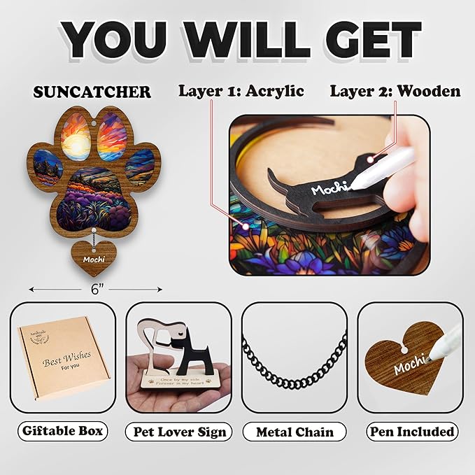- Package Includes: 1 Pet Paw Suncatcher Memorial with a long iron chain, 1 Pet Lover Sign, 1 Pen, and 1 Gift box. Featuring a cute and unique dog paw design, this personalized pet sympathy gift serves as a heartfelt reminder of your beloved four-legged friend, evoking cherished memories.