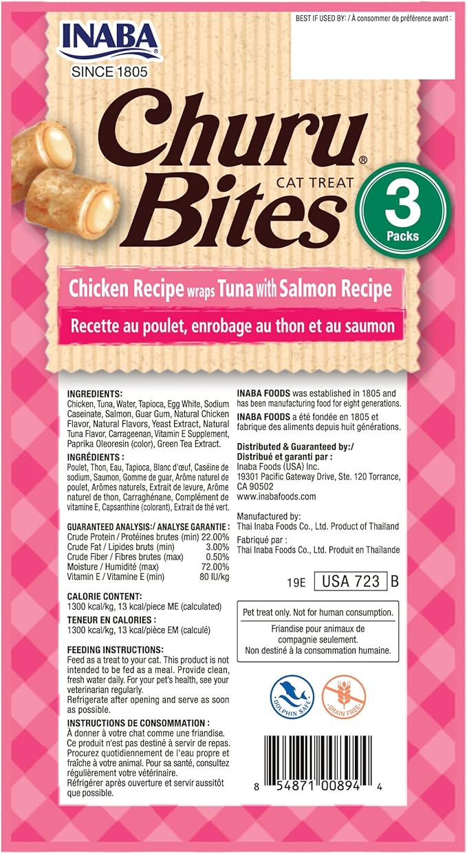 INABA Churu Bites for Cats, Soft Baked Chicken Churu Filled Cat Treats with Green Tea Extract, 0.35 Ounces Each Tube, 9 Tubes Total, Tuna with Salmon Recipe