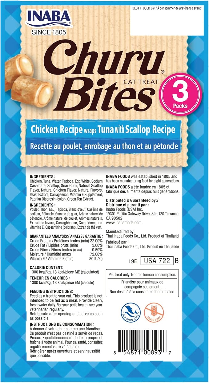 INABA Churu Bites for Cats, Soft Baked Chicken Churu Filled Cat Treats with Green Tea Extract, 0.35 Ounces Each Tube, 9 Tubes Total, Tuna with Scallop Recipe