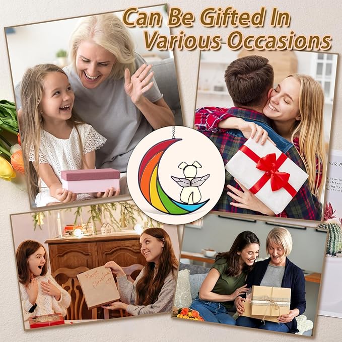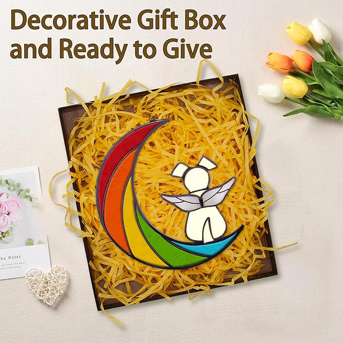 - 【Easy to Install】: SIZE : 5.7"W x 6.3"H. Please use the sticky hooks and chains included in the loss of a pet loss sympathy gift box to hang the suncatcher on a window or sliding door.