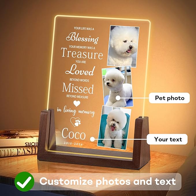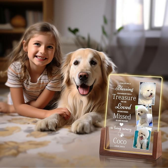 - Dog Memorial Gifts for Loss of Dog: Crafted with care, our pet memorial acrylic night light serve as enduring tributes to your cherished pet. Each night light is meticulously designed to withstand the elements, ensuring a lasting memorial for your furry friend.