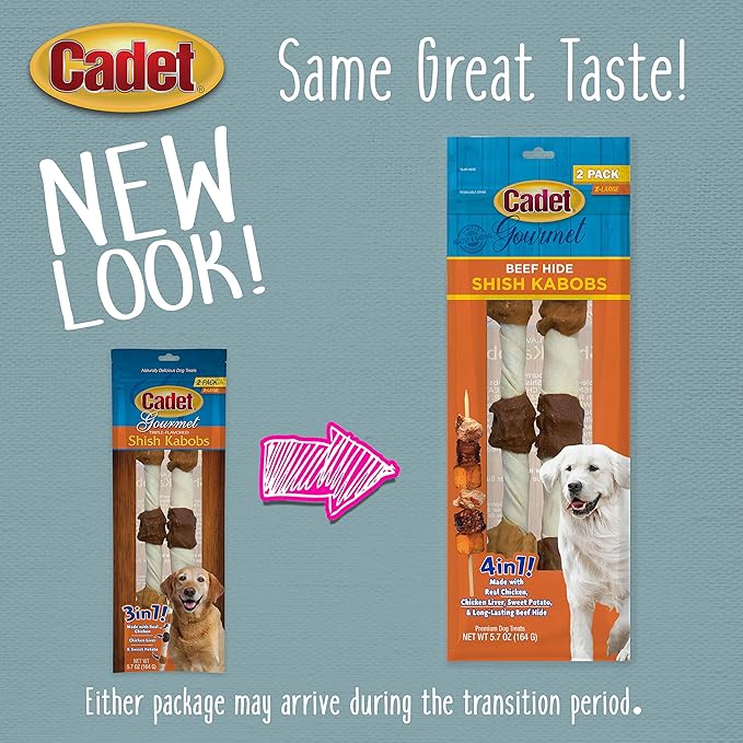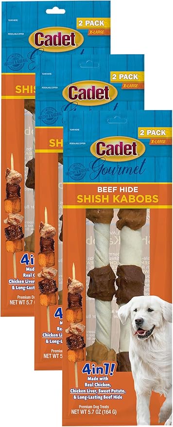 Cadet Gourmet X-Large Triple-Flavored Beef Hide Shish Kabob Dog Treats - Healthy & Natural Chicken, Liver, & Sweet Potato Dog Treats for Dogs Over 30 lbs., 10 in. (2 Count) (Pack of 3)