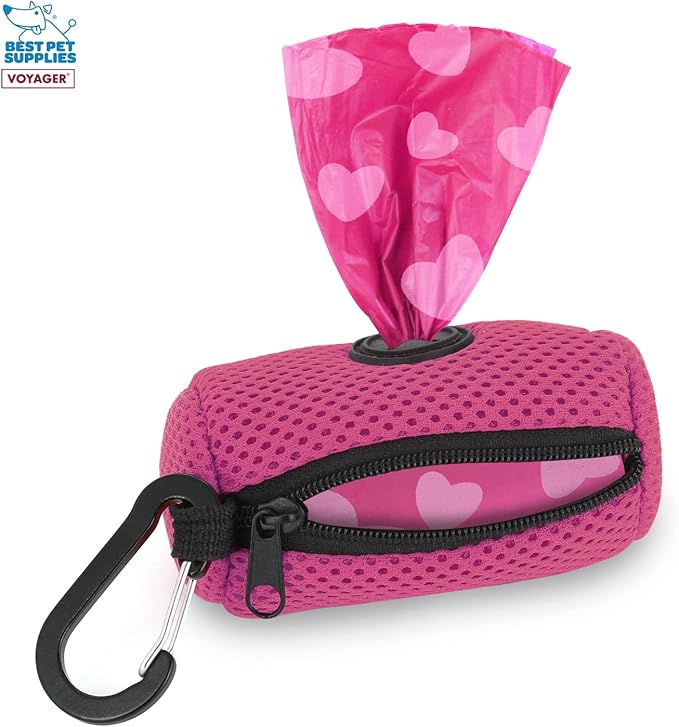 Best Pet Supplies Dog Poop Bag Holder Leash Attachment with 15 Bags, Fuchsia, Reusable Mesh Dispenser Pouch for Travel, Walking, Park, and Outdoor Use, Soft and Durable with Clip-On (Pack of 3)