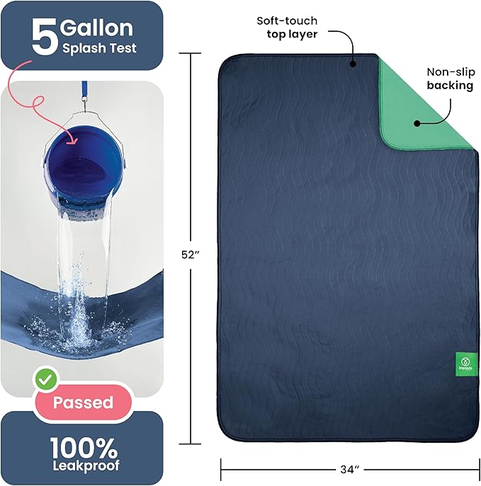 IMPROVIA® Washable Underpads, Heavy Absorbency Reusable Incontinence Pads for Kids, Adults, Elderly, and Pets, Waterproof Protection Floor (Navy & Green, 34"x52" (Pack of 2))
