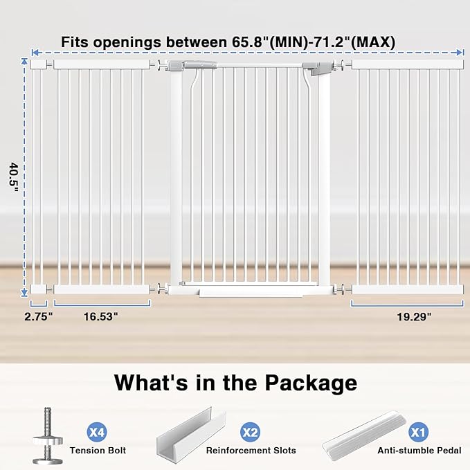 40.55" Extra Tall Baby Gate for Stairs-65.8"-71.2" Wide 1.37" Ultra Narrow Spacing Extra Wide Pet Cat Gate Dog Gate-Auto-Close Pressure Mounted Dog Door for Pets and Kids,White