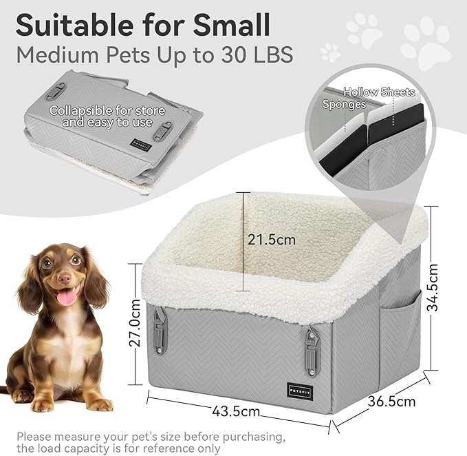 PETSFIT Small Dog Car Seat, Waterproof PU Leather Dog Booster Car Seat with Patented Safe Buckles, Pet Carseat for Medium or Small Sized Pets up to 30 lbs (Grey)