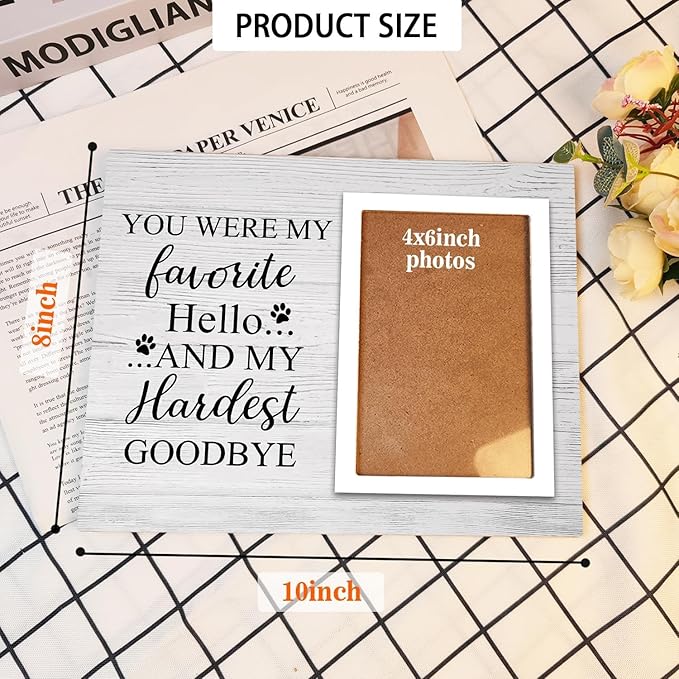 - Dog Memorial Picture Frame:Losing a beloved pet is never easy, but their love stays with us forever. This dog memorial picture frame features the heartfelt quote: "You were my favorite Hello... and my hardest Goodbye." Let this frame keep their memory alive and bring comfort to your heart.
