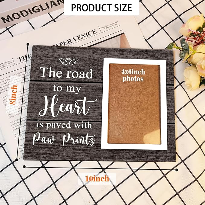 Pet Picture Frame, Pet Wooden Photo Frames Gift, Gifts for Dog Dad Mom, Dog Lovers Gift, Picture Frame for Dogs Cat Pets that Passed, The Road To My Heart Is Paved With Paw Prints, 4x6Inch Photo